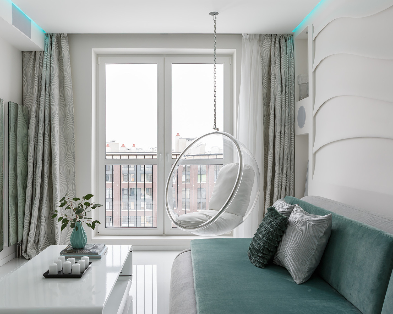 Подвесное кресло Bubble идеально вписалось в светлую гостиную. Выглядит невесомым и визуально не перегружает интерьер. Проект Ирины Халезовой